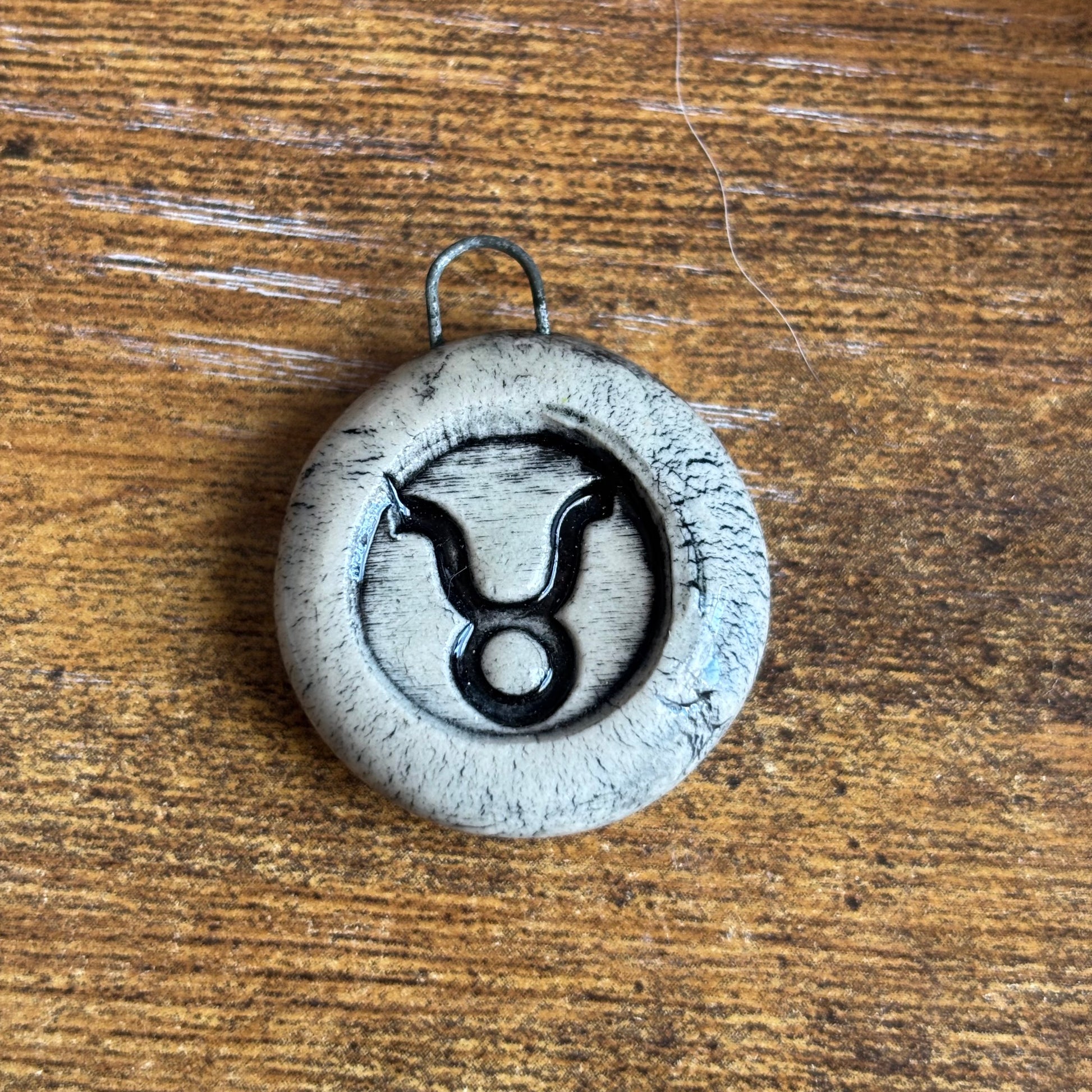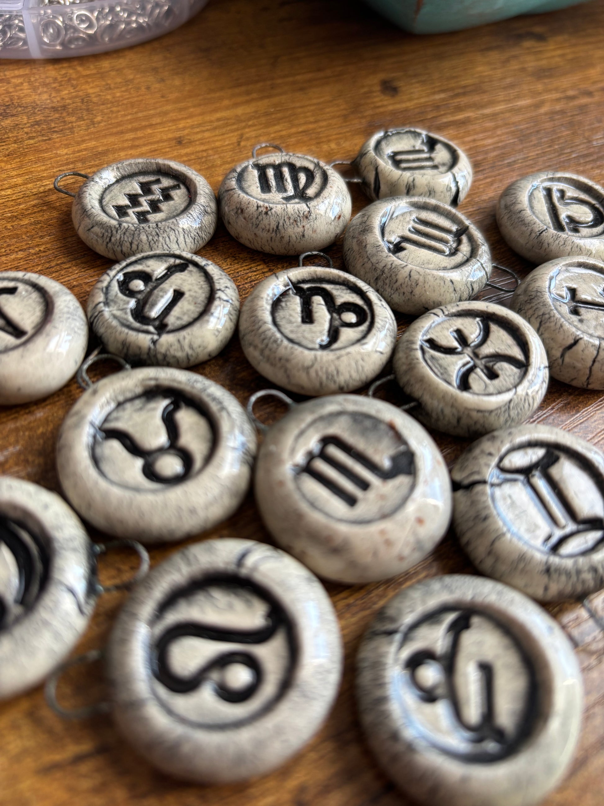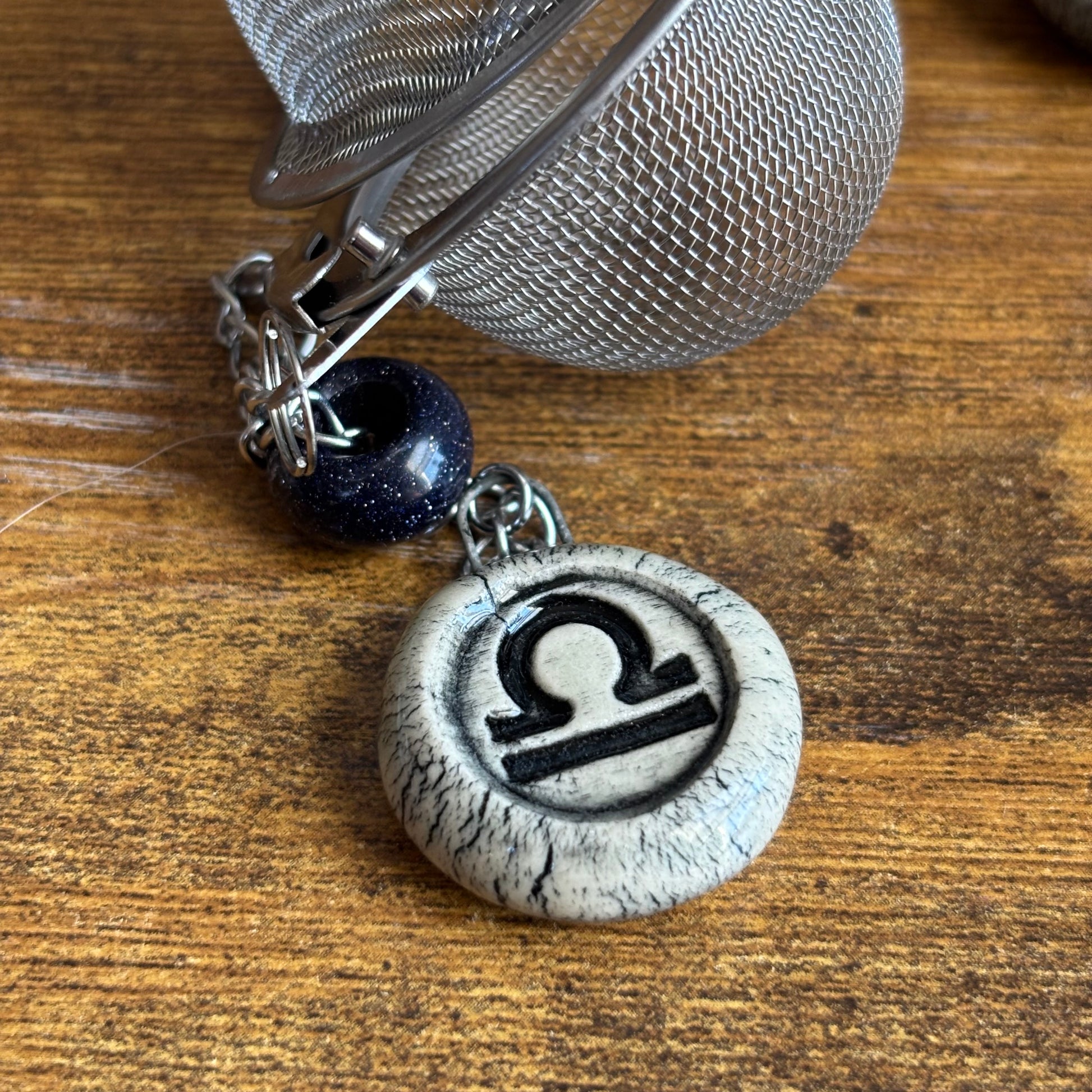 Each charm is made by rolling a ball of clay and stamping the sign into the clay, making each one a little unique. each infuser also includes a blue sandstone crystal bead.