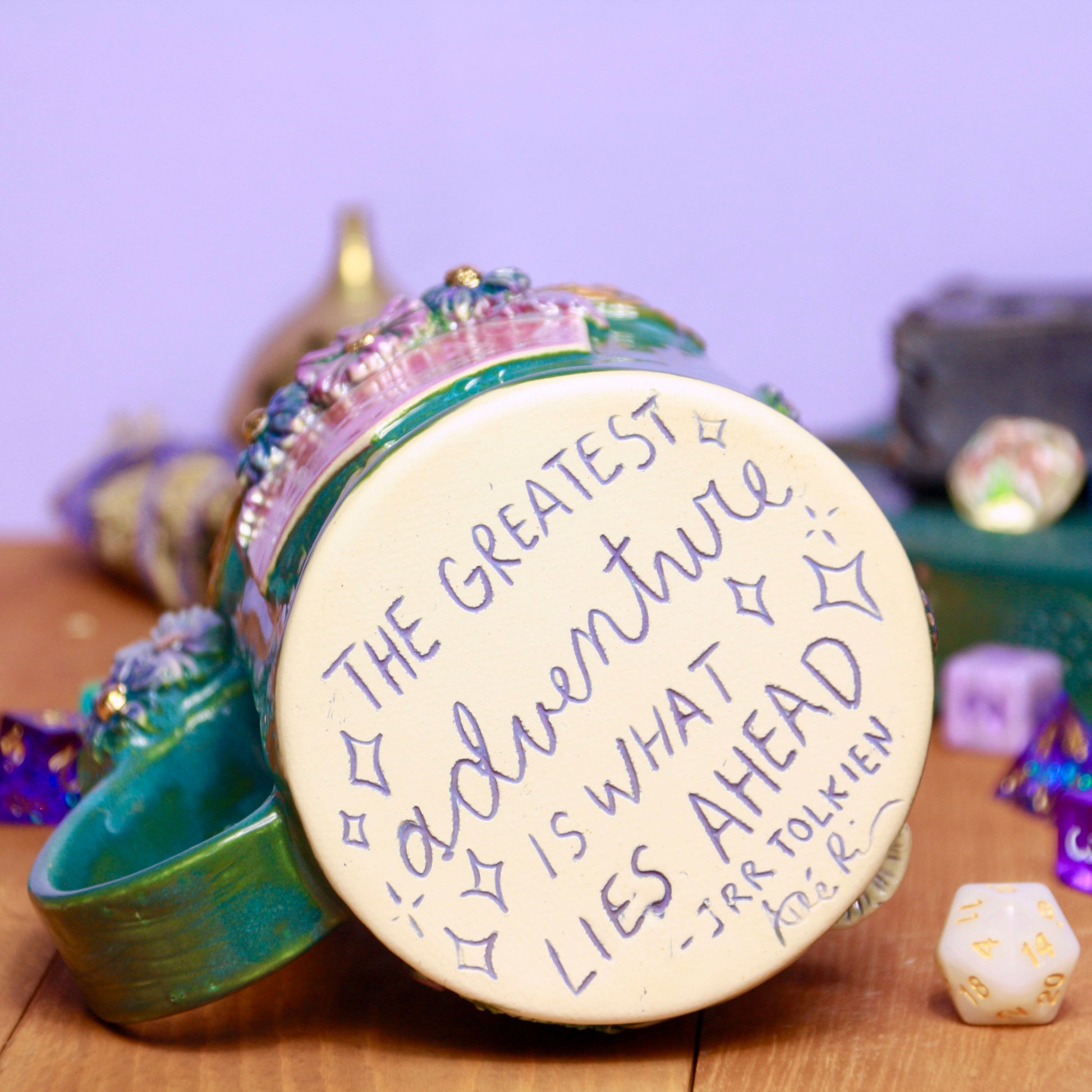 bottom of the mug has a quote from JRR Tolkien, "the greatest adventure is what lies ahead"