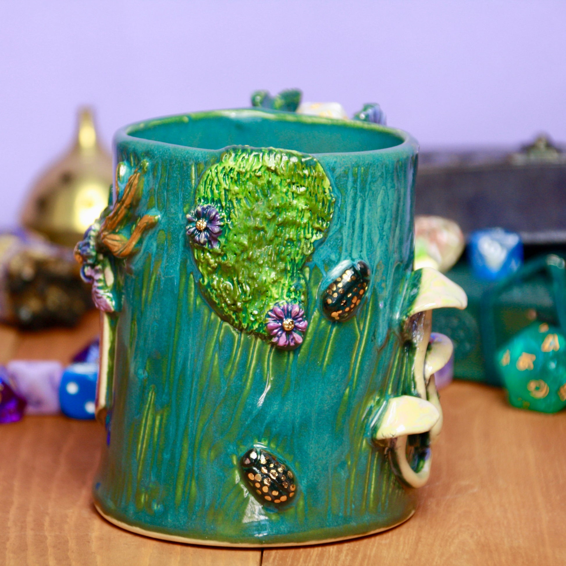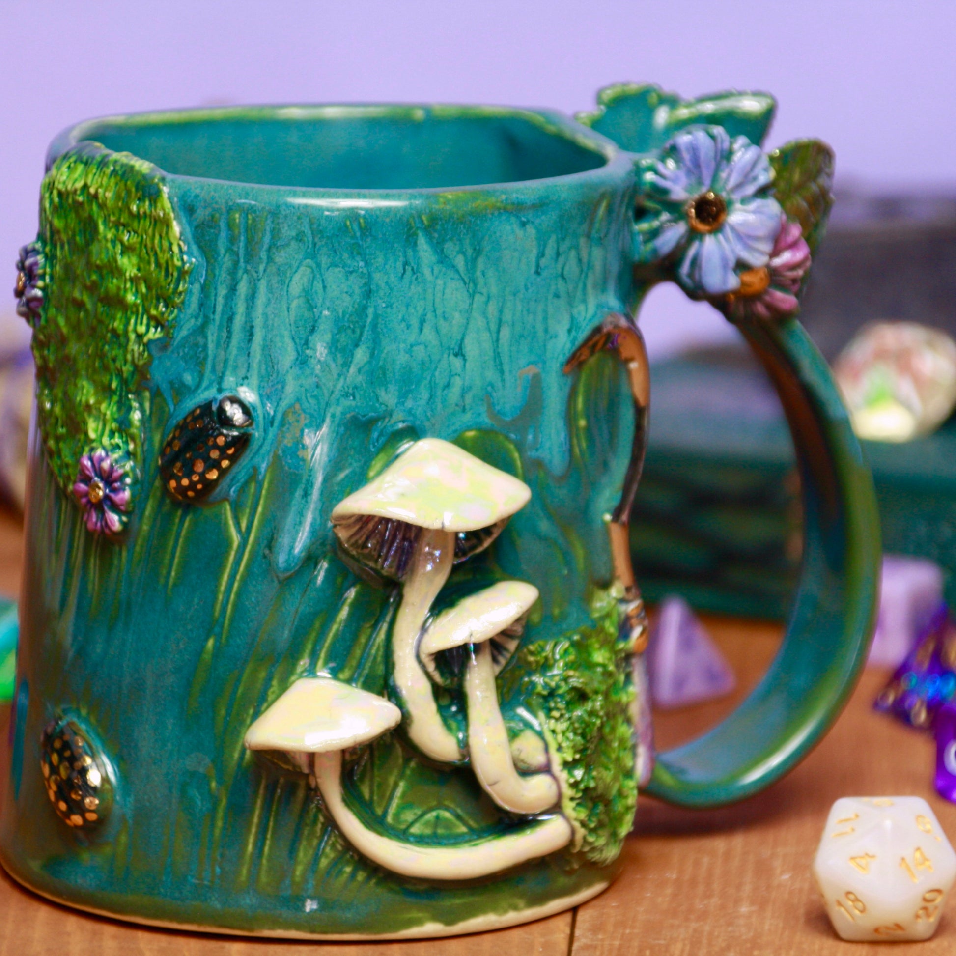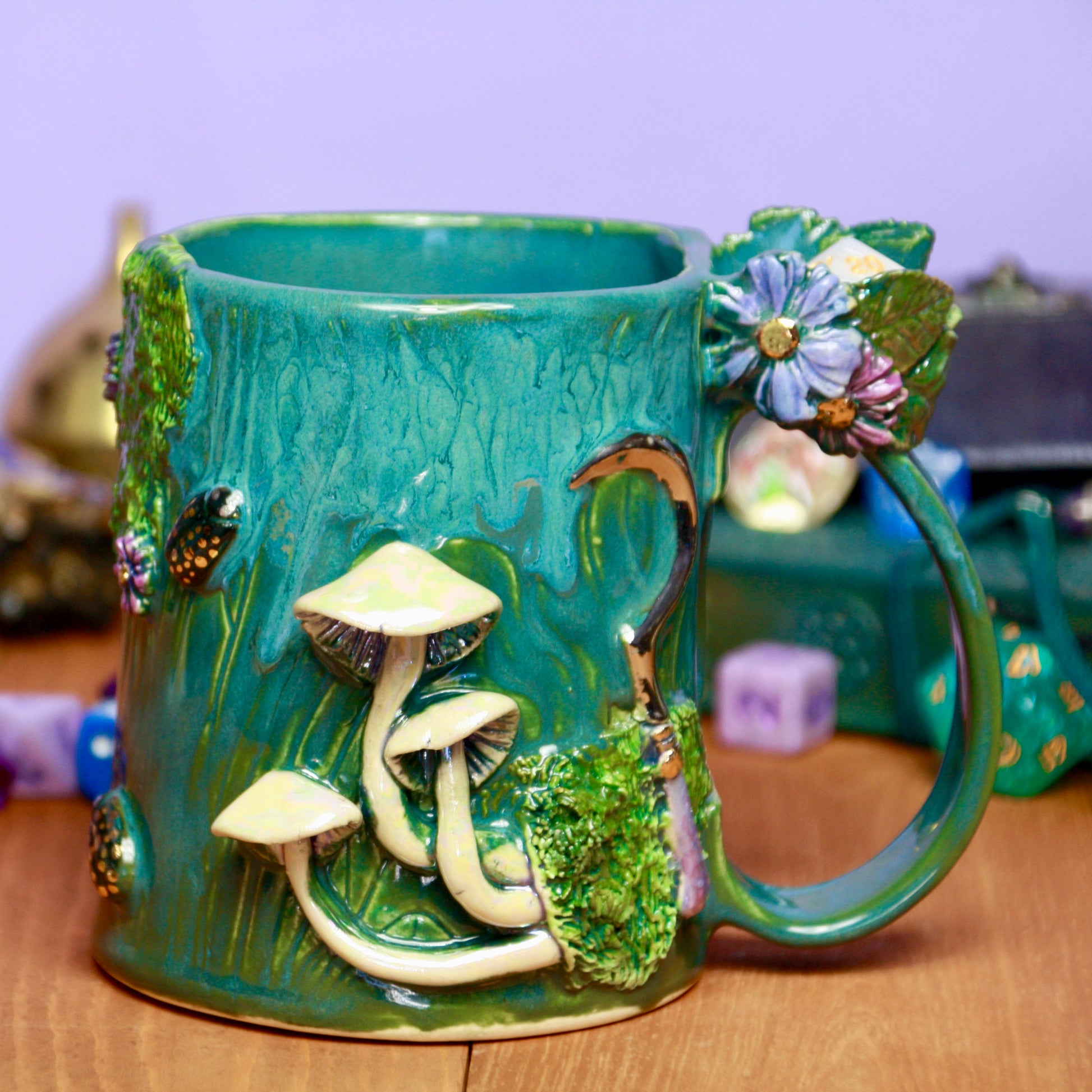 After the ladybugs on the butter dish I had to add a few more. I imagine this mug to fit an adventurer from somewhere deep in the forest because this aqua glaze is so LUSH. It also has dashes of 22k (both traditional bright and white) gold detailing for that extra special touch, iridescent mother of pearl on the mushrooms and d20, and a spot for your favorite d20. Enjoy your favorite warm beverage anytime and be reminded of the splendor of mushrooms!
